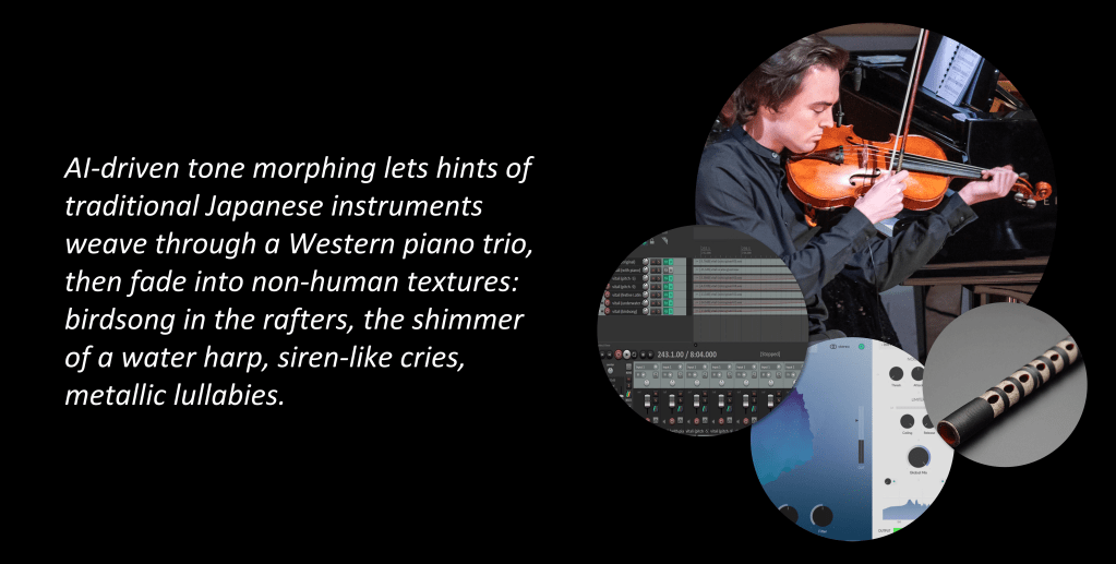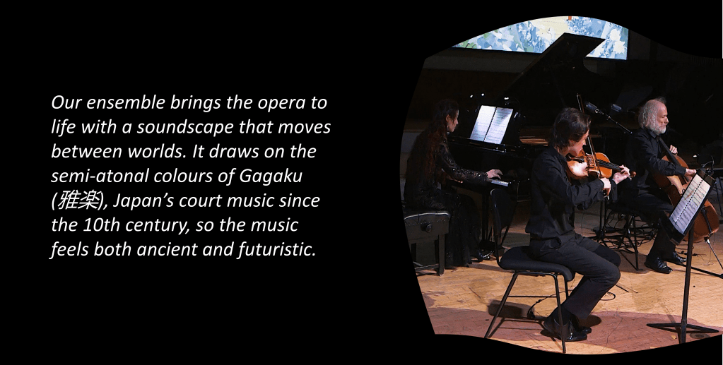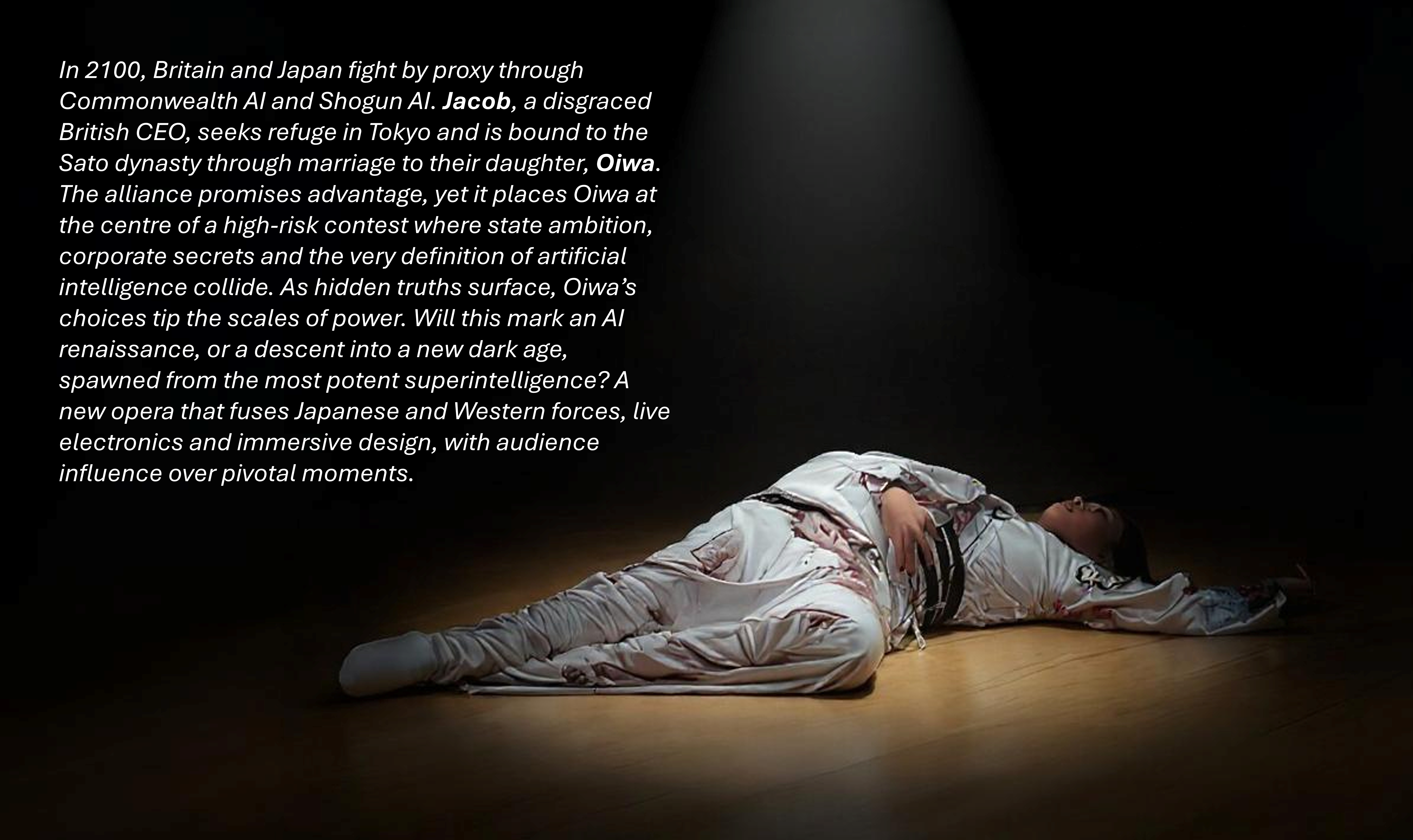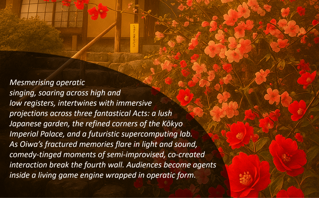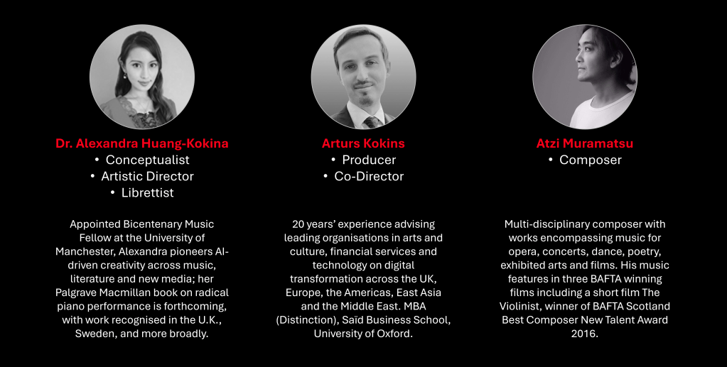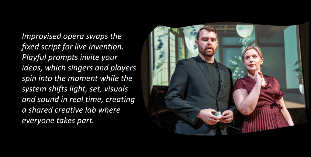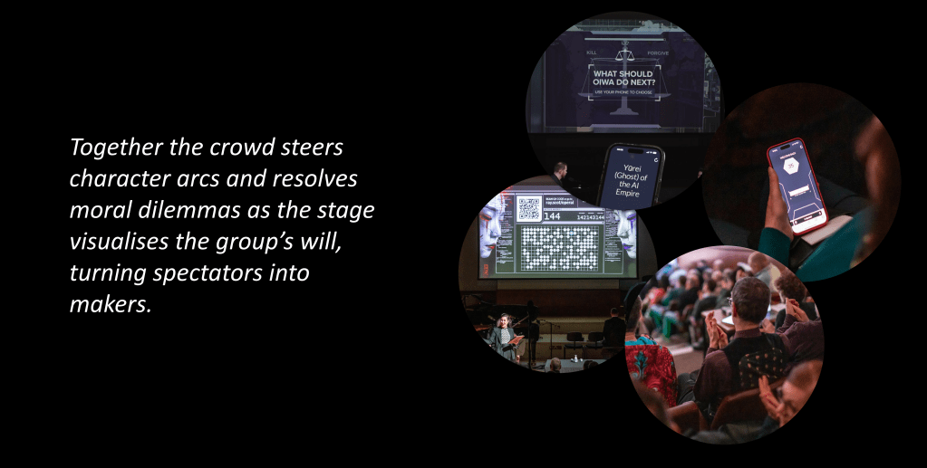 This is an opera about AI and driven by AI, not to replace human artistry but to deepen engagement in live performance. The singers’ voices draw audiences into a world that evolves with their live input, while improvisatory twists keep each performance full of surprise. Audiences can shape a character’s fate, steer the storyline, make music alongside performers, and take part in light-hearted competitions. Every element, from lighting and set design to visuals, lyrics and musical style, can shift in response to audience data. This builds a sense of shared ownership and agency in the unfolding drama.